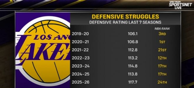 而比進(jìn)攻問題更棘手的,是湖人一如既往糟糕的防守。截至目前,湖人的場均失分達(dá)到117.4分,已經(jīng)超過了球隊的場均得分117.2分,防守效率更是低至117.7,排在全聯(lián)盟第24位,這樣的防守表現(xiàn),完全不符合一支爭冠球隊的定位。同時,球隊的場均籃板數(shù)只有41個,位列聯(lián)盟第26位,籃板球保護(hù)不力,也讓湖人在攻防轉(zhuǎn)換中屢屢陷入被動。盡管湖人的進(jìn)攻效率能夠以117.3排在聯(lián)盟第七,展現(xiàn)出了不俗的得分能力,但如此嚴(yán)重的攻守失衡,注定讓他們難以在季后賽的舞臺上走得更遠(yuǎn)。