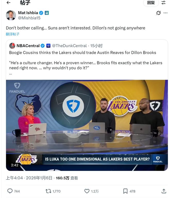 然而,所有的討論和算計,都被菲尼克斯太陽隊老板馬特·伊什比亞用最簡單粗暴的方式終結(jié)了。他直接在社交媒體上轉(zhuǎn)發(fā)了相關(guān)新聞,并配文回應(yīng):“別費勁打電話了,太陽沒興趣交易,狄龍哪兒都不去!”這記來自球隊最高管理層的“官方打臉”,態(tài)度強硬,不留絲毫余地。