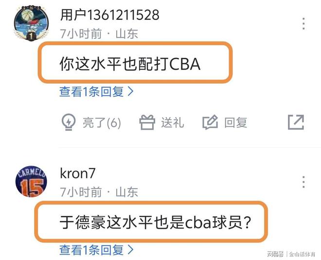 于德豪持續(xù)糟糕的表現(xiàn),也遭到網(wǎng)友吐槽?!叭绻皇乔锉鞄е?你的水平不配打cba”;“你這水平也配打CBA?”;“于德豪這水平也是cba球員?”;“北京首鋼核心-于德豪”;“聽說還是國家隊隊員”;“今天差點(diǎn)就要拿到北京戶口了,奈何外援大哥不同意”;“這貨有能力打CBA么,山東那么缺人么”;“差點(diǎn)最后輸他身上”……