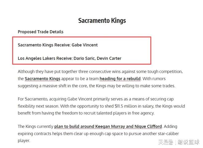 媒體FW支招湖人,應該考慮做1換2交易,可以送替補后衛(wèi)蓋布-文森特去國王。而具體交易方案里,湖人除了得到老將達里奧-薩里奇,還可以嘗試撿漏后衛(wèi)德文-卡特,他在國王確實境遇不佳。