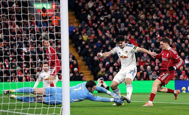2天后要奔赴倫敦連戰(zhàn)富勒姆和阿森納,面對客場防守稀松的利茲聯(lián)(此前客場比賽全部有丟球),斯洛特繼續(xù)將小傷在身的維爾茨放在了前場偏左的位置,畢竟上輪對壘狼隊,德國人就在這個角色上干得不錯。開場階段,維爾茨和埃基蒂克的呼應也的確不少,法國前鋒首次射正被盧卡斯·佩里撲出后,第二次內(nèi)切選擇找到小禁區(qū)邊緣的維爾茨,但后者跟進推射被封堵。眼見客隊三中衛(wèi)守得腹地密不透風,利物浦由瓊斯等人逐漸增加外圍發(fā)炮,孰料本方禁區(qū)卻險些被偷襲得手。阿利松幾乎沒有難度的出球直接送到安帕杜腳下,好在后者也沒做足射門準備,掄了一腳也是回傳力度。