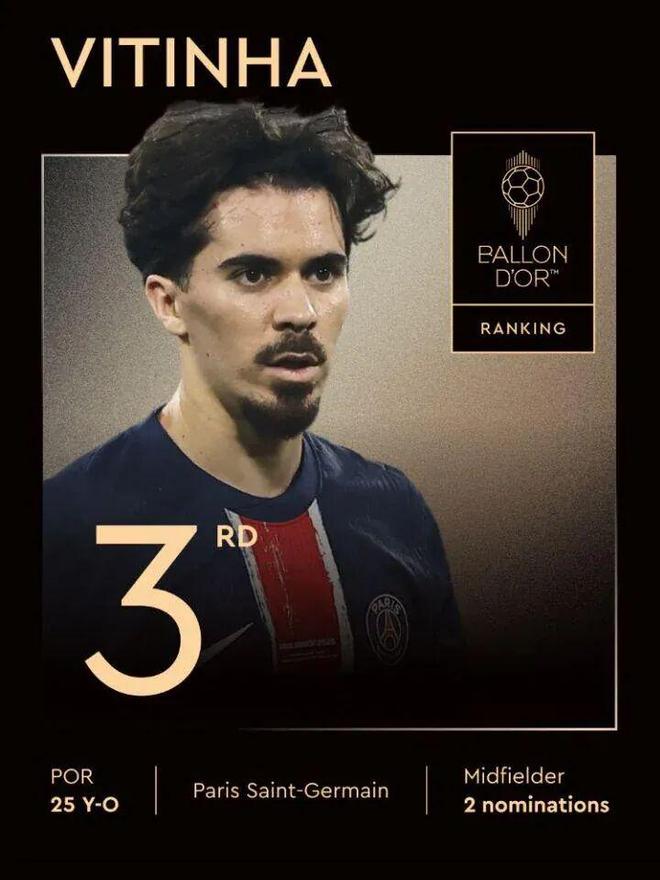 常規(guī)的2024-25賽季再加上擴(kuò)軍版世俱杯,維蒂尼亞最終各線出戰(zhàn)59場(chǎng)貢獻(xiàn)8球5助攻。從2025上半年直到7月的發(fā)揮,都屬絕對(duì)的上乘,維蒂尼亞最終在金球獎(jiǎng)評(píng)選中排名第3,實(shí)至名歸,也是彌足珍貴:自哈維、伊涅斯塔鼎盛的年代之后,最近十余年也只有莫德里奇、羅德里兩位金球得主,以及若日尼奧、德布勞內(nèi)、貝林厄姆等少數(shù)代表,能夠作為中場(chǎng)躋身金球評(píng)選前三。