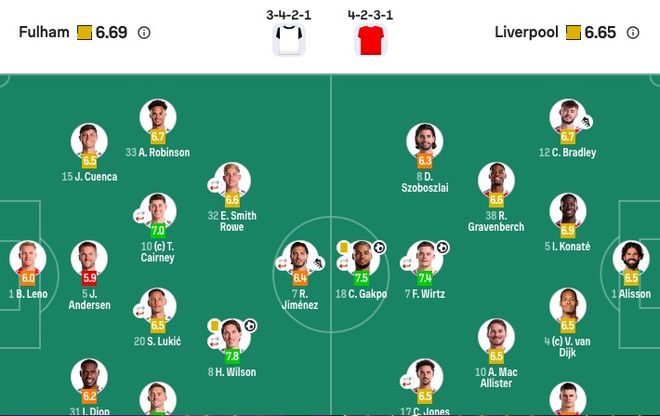 富勒姆首發(fā):1-萊諾、31-迪奧普、5-安德森、15-昆卡、21-卡斯塔涅、20-盧基奇(92'6-里德)、10-凱爾尼(74'16-貝格)、33-羅賓遜、8-威爾遜(85'11-阿達瑪-特勞雷)、32-史密斯-羅(74'22-凱文)、7-勞爾-希門尼斯(85'18-阿薩雷)