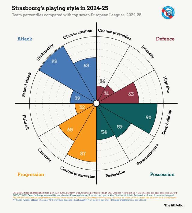 當我們以2024-25賽季(上一個完整賽季)的數(shù)據(jù),將他們的比賽風(fēng)格與歐洲前七聯(lián)賽對比時,這種方法得到了體現(xiàn)。請注意,他們在本方三區(qū)的傳球是多么深思熟慮(深度組織,99分制中的90分),以及他們多么希望通過球場中路推進皮球(中路推進,99分制中的87分),以此支撐其前場的進攻推進方式。