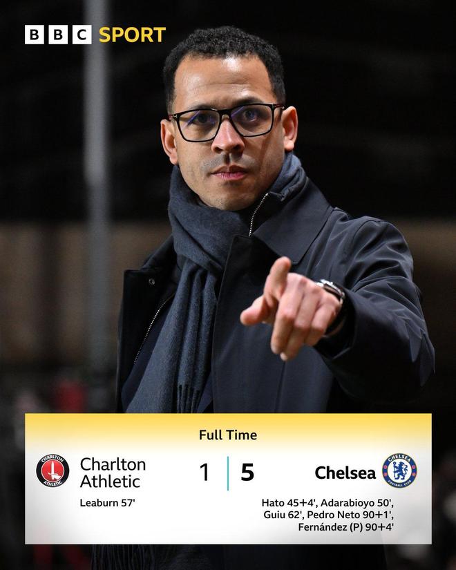 切爾西在第62分鐘再次進(jìn)球。博納諾特遠(yuǎn)射被撲出,吉烏抓住機(jī)會(huì)補(bǔ)射破門。此后切爾西陸續(xù)進(jìn)行換人調(diào)整,先是派上埃斯特旺,隨后派出了恩佐-費(fèi)爾南德斯和德拉普。補(bǔ)時(shí)階段,切爾西連進(jìn)2球。內(nèi)托和恩佐-費(fèi)爾南德斯各進(jìn)一球,殺死比賽。最終的比分定格為5-1,切爾西淘汰查爾頓。