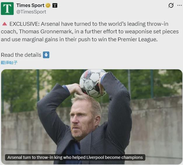 泰晤士報(bào)消息,世界頂尖的界外球教練托馬斯-格羅內(nèi)馬克一直在以顧問的身份與阿森納合作,他參觀了槍手的訓(xùn)練場(chǎng),并分享了自己的技術(shù)和知識(shí),北倫敦豪門正進(jìn)一步致力于把定位球戰(zhàn)術(shù)打造成他們的制勝武器。